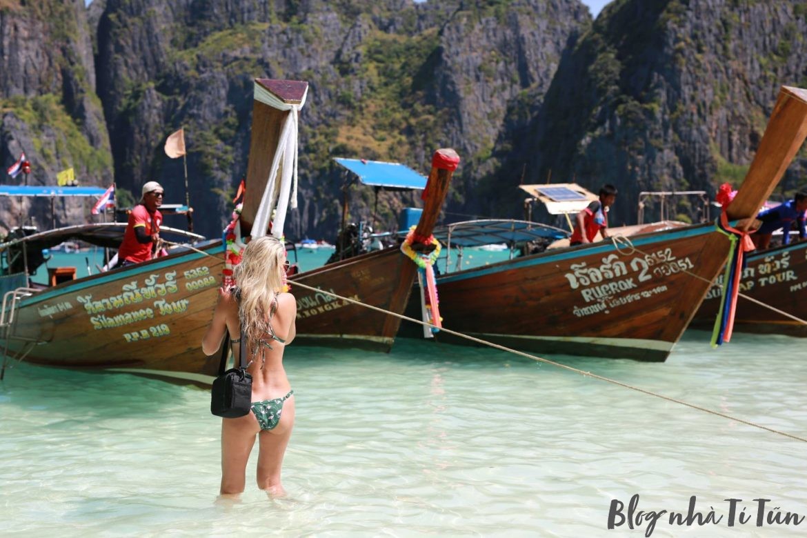 - Phi Phi Leh (bãi Maya Beach) đẹp nhưng rất đông. Nếu muốn tránh lúc đông người thì bạn nên đi sáng sớm hoặc chiều tối. Giờ cao điểm ở Maya beach là từ 10h-15h, khó khăn lắm mới chụp được vài tấm không có người xung quanh 😀